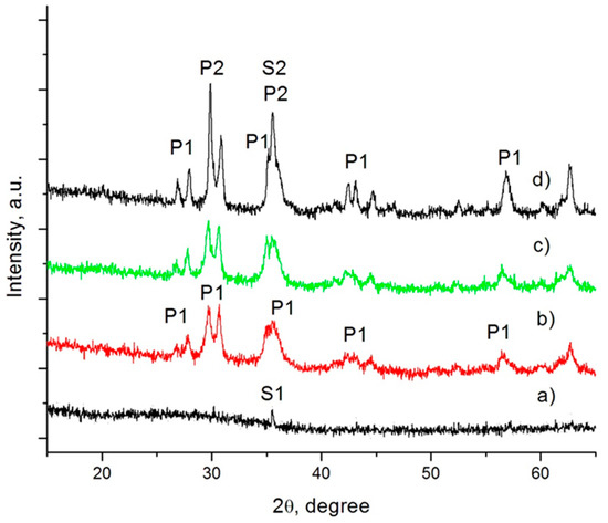 In sample GC60-1, the formation of some pyroxene phase (labelled P1) was also identified. After 5 min crystallization at 730 °C, some increasing in its amount were observed. In the final glass-ceramics (see Figure 3d), together with P1, a new pyroxene phase, one which practically becomes the main crystal phase in the material (labelled P2), is formed. According to the structural analysis P1 is characterized with a unit cell with V~428 × 106 pm3, whereas in P2, V~422 × 106 pm3. This difference is about 1.5%, and it clearly highlights a variation in the chemical compositions of both pyroxene phases. It can be assumed that some larger ions participate in the formation of the P1 phase. Additionally, some increase of the spinel phase is observed, which must be related to the formation of “secondary” magnetite spinel (labelled S2).