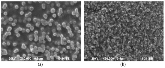Figure 5a,b elucidates areas free of “preliminary” spinel in samples GC0-1 and GC60-1, respectively. These SEM results demonstrate that without treatment at 650 °C, the size of iron-rich drops is in the range of 150–250 nm, while after the “nucleation step” it decreases to 50–70 nm and the number of drops significantly rises (from 15 ± 5 per µm2 in GC0-1 to 50 ± 10 for GC60-1). This result clarifies that during the nucleation step binodal liquid–liquid separation occurs.