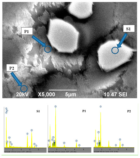SEM image of sample GC0-60 with EDS spectra of formed-crystal phases S1, P1 and P2.