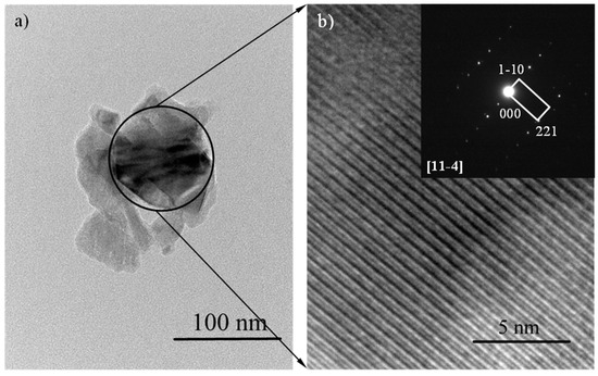 Finally, TEM observation of the final glass-ceramic elucidates that the main P2 phase is composed of mono-crystals. Figure 10 shows a single pyroxene crystal from sample GC60-60, which is embedded in an amorphous glass matrix with lower contrast. The SAED patterns and the HRTEM fringes reveal the single crystalline structure of the particle and its orientation along zone axis /11-4/. The phase identification highlights a monoclinic clinopyroxene with cell parameters a = 9.724, b = 8.875, c = 5.281 and β = 107.24 (PDF 85-1740), which is in an agreement with the XRD data.
