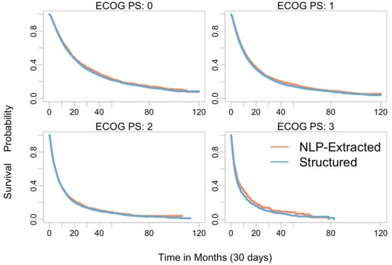 In conclusion, we developed an NLP algorithm that extracts ECOG PS scores from unstructured documents across an EHR network of diverse real-world clinical settings. The algorithm improves the completeness of a critical variable at the time of treatment initiation and performs well across 21 distinct cancer types. Furthermore, additional validation, including the comparison of rwOS of patients with extracted vs. structured ECOG PS scores within a cohort of patients with aNSCLC, demonstrated clinically expected results. The use of high-performing algorithms such as this can help to overcome key challenges in RWD, such as missingness, as well as make one of the key advantages of RWD more attainable: the capability to aggregate longitudinal routine clinical care information from large patient cohorts for high-quality clinical research, ultimately benefiting providers, regulatory stakeholders, and, most importantly, patients.