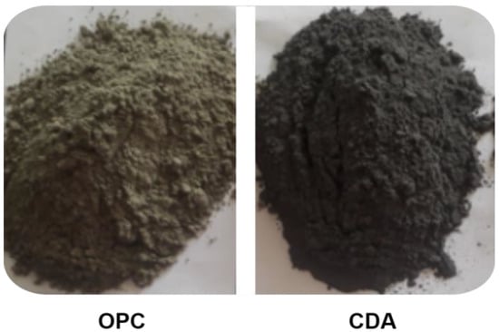 The cow dung samples were obtained from the cattle production area surrounding the city of Bahir Dar, Ethiopia. The samples were sun-dried for a week and subsequently calcined in a muffle furnace at 800 °C for 2 h. This particular temperature was chosen as it was found to yield CDA of superior quality [28]. Once burned, the samples were allowed to cool and then ground using a milling machine. Samples that passed through a sieve size of 150 µm were used for cement replacement. The resulting cow dung ash had a dark gray appearance, as shown in Figure 2.