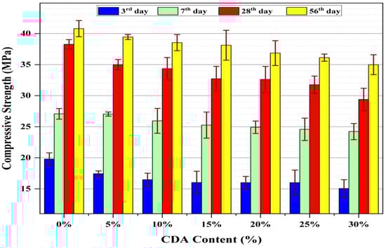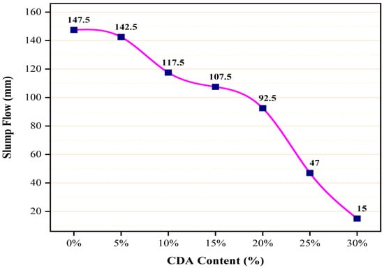 The workability or fresh property of the plastic mortar was determined by measuring its consistency using the flow table method in accordance with ASTM C1437. The result of this test is shown in Figure 3. As can be observed from this figure, the slump of the mortar decreased significantly with increasing levels of CDA replacement. The greatest reductions in slump were observed for CDA replacement levels of 25% and 30%, with slumps decreasing by 68% and 90%, respectively, compared to the reference mix (CDA0). Similar findings were reported by [29,30]. This phenomenon is primarily attributed to the higher porosity of CDA particles in comparison to cement. The porous nature of CDA particles leads to an increased absorption of mixing water within the mixture, especially as the proportion of CDA in the mixture increases. Consequently, compensating for the reduced workability resulting from CDA utilization necessitates a higher quantity of superplasticizer to maintain the desired workability of the mortar. According to ASTM C1437, the initial flow of the mortar should be 110 ± 5%. Hence, only the fresh mortar containing 15% CDA met this requirement.