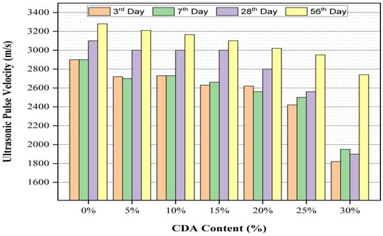Figure 5 displays the results of the ultrasonic pulse velocity (UPV) test conducted to evaluate the homogeneity of the reference and CDA-containing mortar specimens. It is evident from Figure 5 that the ultrasonic pulse velocity of the mortar decreased with an increase in the percentage of CDA. The results suggest that the homogeneous characteristics of the mortar are compromised with an increase in the percentage of CDA. The trend observed in the results of the UPV test is consistent with the findings of the compressive strength tests. The experimental results indicate that the UPV values for CDA percentages of 0% to 30% were 2900–1814 m/s, 2900–954 m/s, 3100–1954 m/s, and 3280–2742 m/s after 3, 7, 28 and 56 days of curing age, respectively. As observed from the figure, there were no significant differences in the UPV values between the 3rd and 7th day results; however, the UPV values changed remarkably after later ages. The 28th day UPV results were 4.5–11.5% higher than the respective 7th day results, and the 56th day UPV results were 5–28.7% higher than the respective 28th day results. According to IS 13311 (Part 1): 1992 [35], the quality of the mortar in terms of uniformity was medium strength up to 25% CDA cement substitute.