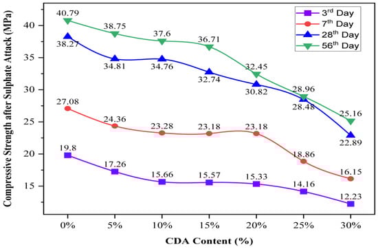 All of the mortar specimens’ ability to withstand sulfate attack was determined by analyzing the variations in their compressive strength following exposure to a sodium sulfate (Na2SO4) solution. Figure 6 illustrates the results of the test depicting the variation in compressive strength of mortar containing CDA, subjected to sulfate attack, in comparison to the control mortar sample, at various curing periods. It is evident that the mortar specimens containing up to 10% CDA are able to withstand sulfate attack without much impact on their compressive strength, as the reduction in strength is negligible. Furthermore, it was observed that the compressive strength starts to decrease beyond 15% CDA content, which means that at CDA20 to CDA30, the sodium sulfate significantly affected the strength of the mortar specimens. This phenomenon can be attributed to the high quantity of CaO and the formation of a gel, particularly when the CDA replacement ratio exceeds 10%, as demonstrated by the microstructural tests discussed in Section 3. Consequently, the density of mortar samples decreases, allowing for the diffusion of sulphate ions into the mortar pores. This accelerates the chemical reaction between the hydration products of cement, such as Na2SO4 and sulphate ions, with Ca(OH)2 and monosulfate, resulting in the formation of gypsum and ettringite (crystal needles) within the mortar pores [36]. These factors collectively have a negative impact on the mortar’s ability to resist sulfate.