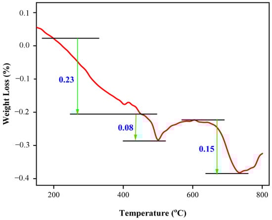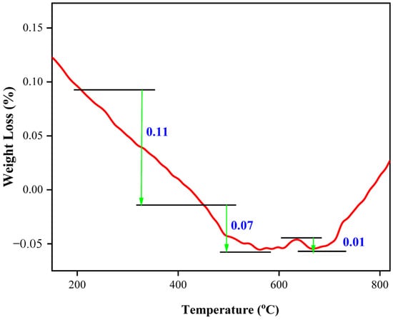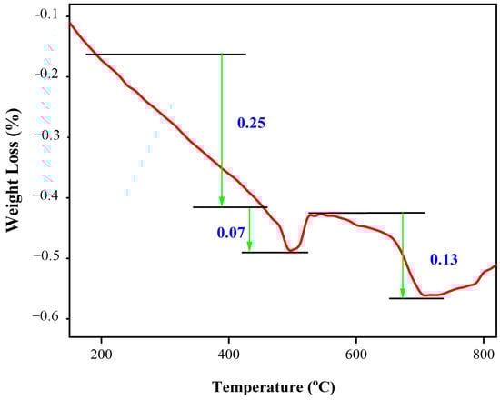Figure 7, Figure 8 and Figure 9 illustrate and compare the thermogravimetric (TGA) analyses of mortar samples containing 10%, 20%, and 30% CDA, respectively, after being cured for 28 days. In all figures, the weight loss was determined by subtracting the level of the lower line y-axis from that of the upper line y-axis. According to Figure 7, after 28 days of curing, the mortar sample containing 10% CDA underwent a weight loss of 23% at a heating temperature of 450 °C due to the decomposition of CaO and water from C–H. The weight loss decreased by 8% after an increase in temperature to 500 °C, and then increased again up to a heating temperature of 600 °C. From 600 to 750 °C, the weight loss of the mortar sample significantly decreased by 15% due to the decomposition of water and the C–S–H gel, as well as the carbonation of CO2 from CO3. In the case of the 28-day cured mortar sample containing 20% CDA (Figure 8), the trend of thermal stability was almost similar to that of the 10% CDA sample. The mortar samples containing 10% CDA revealed that the Ca(OH)2 dehydrated and lost approximately 25% its weight at a temperature of 450 °C, with only a 7% weight reduction up to 500 °C. Additionally, the figure elucidates that there was no further weight loss when the heating temperature was increased from 500 °C to 550 °C. However, both CaCO3 and the C–S–H gel released CO2 and water, respectively, and lost 13% of their weight as the temperature increased from 500 °C to 700 °C. Further increases in temperature did not appear to affect the thermal stability of the mortar. The percentage weight loss for the mortar sample containing 30% CDA, which was cured for 28 days, is presented in Figure 9. It can be noticed that the weight loss of the mortar continuously decreased with an increase in temperature up to 450 °C due to the evaporation of water from the C–H gel. It can also be observed that it exhibited a weight loss of 11% due to the evaporation of water from the C–H gel, which was relatively smaller than that of the 10% and 20% CDA mortar samples. Furthermore, the weight loss due to carbonation and dehydroxylation was insignificant compared to the other samples, with a combined weight loss of about 8% at a heating temperature between 450 °C and 700 °C. This indicates that either there were no CaO, CO2, and H2O molecules in the C–S–H gel and CaCO3, as all these oxides were released at a temperature of 450 °C, or the heating temperature might not have been sufficient in order to remove the oxides. Generally, for all the mortar samples containing 10%, 20%, and 30% CDA, the thermal stability of 28-day cementitious pastes would not be significantly affected in a temperature range of approximately 500–600 °C.