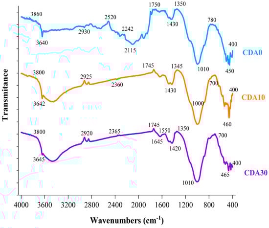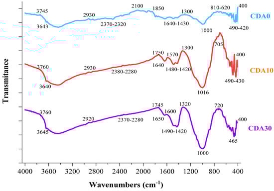 The result of the Fourier-transform infrared spectroscopy (FTIR) analysis conducted on the mortar samples containing CDA content of 0%, 10%, and 30% after 7 and 28 days of curing is shown in Figure 10 and Figure 11, respectively. The FTIR spectra for the 7-day samples, as shown in Figure 10, reveal major peaks at 3860–3640, 2930–2115, 1750–1345, and 1100–450 cm−1. On the other hand, the spectra for the 28-day samples (Figure 11) exhibit major peaks at 3760–3640, 2930–2280, 2100–1300, 1016–620, and 490–420 cm−1. The wavenumbers, curves, peaks, and valleys observed in the FTIR spectra of the selected mortar samples, i.e., CDA0, CDA10, and CDA30 were almost identical for both curing periods. This suggested that the CDA content had no significant effect on the hydration product during the development of the hydration process, despite minor differences in wavenumbers observed between the 7th and the 28th day samples. Figure 10 illustrates that unreacted particles were detected at the major peak wavenumbers of 744 cm−1 for CDA0 and CDA10 samples. However, for CDA30 samples, the wavenumbers increased and extended to the range of 813–681 cm−1. The abundance of unreacted particles can impede the activation reaction, resulting in a delayed early-age strength development. Additionally, the production of a C–S–H gel was lower in the CDA10 and CDA30 mortars, while CDA0 exhibited superior C–S–H gel production compared to CDA10 and CDA30. The wavenumber band between 1644 and 1000 cm−1 indicates the presence of small amounts of carbon and the O–H–O extending and stretching vibration between 3460 and 1727 cm−1 suggests the presence of free water.