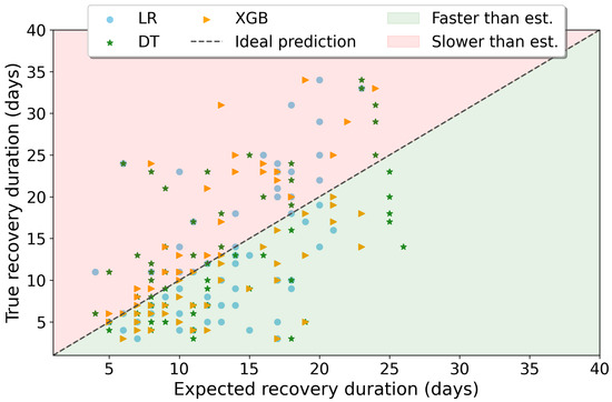 Estimated versus true recovery duration for LR (blue circles), DT (green asterisks) and XGB (orange triangles) algorithms. The diagonal black dotted line represents ideal estimations, while green and red backgrounds indicate that the recovery was faster or slower than estimated, respectively.