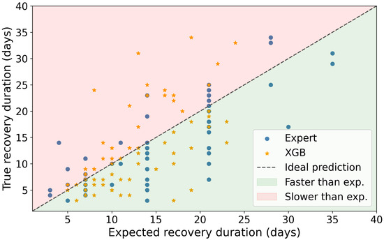 Comparison of the estimations made by the expert (blue circles) with the predictions of the best performing algorithm, XGB (orange asterisks). The black dotted line shows ideal predictions, while green and red backgrounds indicate cases where the recovery was faster or slower than expected.