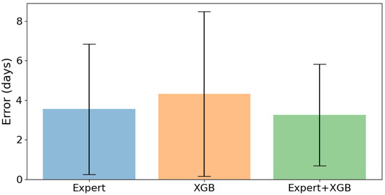 A bar plot showing the mean MSE of expert’s estimations (blue bars), XGB model (orange bars) and XGB model with the inclusion of expert’s predictions as a feature (green bars). The black lines on each bar indicate the corresponding standard deviation of the MSE.