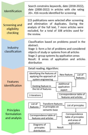 These categories were selected after an initial review of the articles. Subsequently, each article was analyzed in detail to identify the features of application (principles) of the approach used and to identify whether systems engineering and system modeling were mentioned in it. The principles discovered were included in the general list if they differed from those already identified in previous articles and had characteristics that could supplement or clarify any of the previously listed principles. In some cases, there was a direct indication of the use of a specific principle, but more often, actions were described within the framework of the MBSE approach. Based on the description of such an activity, it was concluded that it corresponded to one principle or another. To justify inclusion in the list, a quote was provided for each identified principle, based on which a conclusion was made about its use. In addition, the authors considered enough industries to confirm the accuracy and universality of our principles.