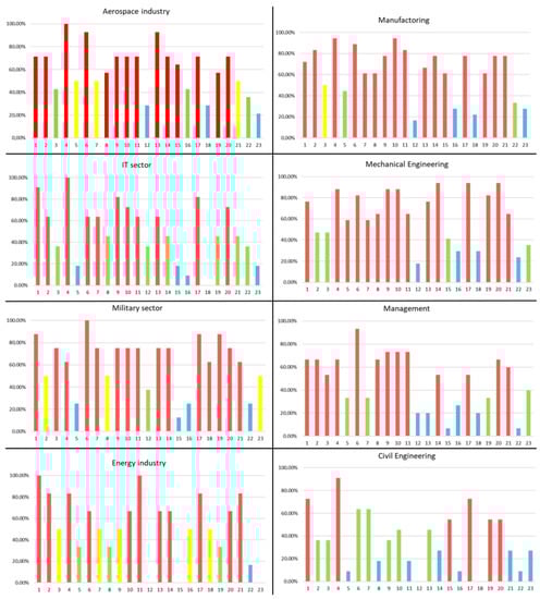 To compare the distribution and determine the most used principles across all industries, a summary chart was created (Figure 4). The chart shows the industries mentioned in the studies, with the horizontal axis representing the principles mentioned in research papers. Fragments related to different industries are highlighted in color.