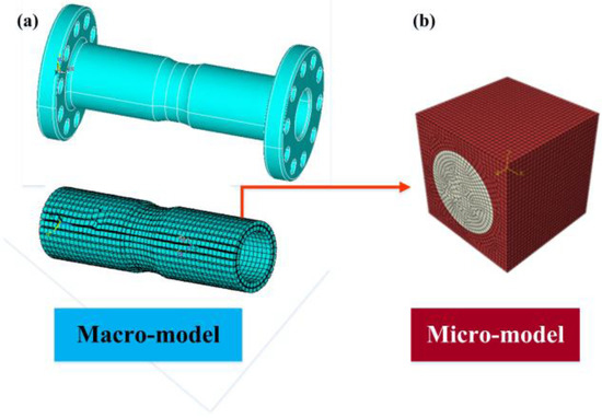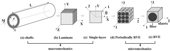 The SiCf/TC4 composite shaft has a cylindrical structure and is synthesized by the lamination of multiple layers of fibre-reinforced composites. Fibre-reinforced metal matrix composite shafts are prepared through a fibre-winding process [1,28,29], and can be divided into single-cell RVEs, periodically arranged RVEs, single-layer materials, and laminated materials. Further, the order of material structure scales—from small to large—is from macro-mechanical to micro-mechanical [7], as shown in Figure 1.
