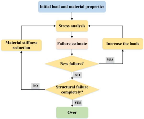 According to the conclusions drawn in a study by Echaabi [29], the Hashin criterion is able to distinguish the physical properties of fibre and matrix damage. Therefore, the Hashin criterion was used to determine the damage initiation during the progressive failure analysis herein; the progressive failure flow, combined with the computational model in this paper, is illustrated in Figure 4. The following five different damage modes were considered in the model: fibre tensile failure, fibre compression failure, matrix tensile failure, matrix compression failure, and matrix fibre shear failure [30,31]. As far as the fibre-reinforced metal matrix composite is concerned, the stress–strain relationship in the principal coordinate system can be expressed as follows: