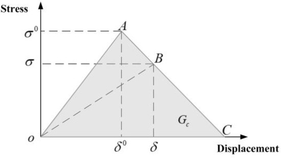 The damage initiation displacement can be calculated by the following expression: , where the damage initiation strain is defined as follows: . The complete failure displacement can be expressed as follows: , where Gc is the fracture toughness (this is the shaded area in Figure 5).