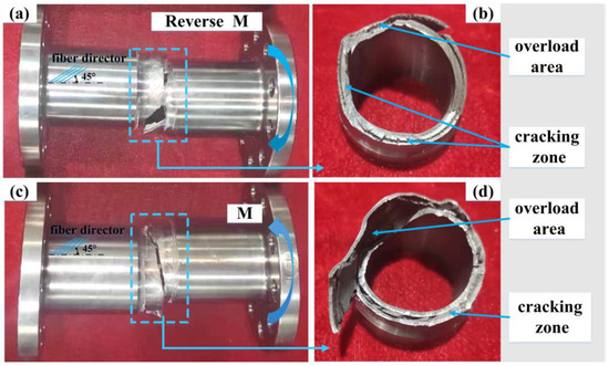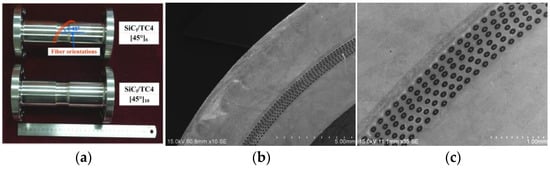 It is well-established that weight reduction and increases in efficiency are the design requirements of next-generation aero-engines. Without changing the structural layout, new types of materials with unique properties should be fabricated [1,2,3]. From this perspective, metal matrix composites have a higher specific strength and specific stiffness than conventional metallic materials [4,5]. The SiCf/TC4 composite is a type of long fibre-reinforced metal matrix composite that has been widely used in the shafts of many engines to achieve the above-mentioned objectives [6,7]. The damage processes of SiCf/TC4 composites, which are regarded to be anisotropic materials, are complex and diverse. Further, the shaft also needs to withstand torque as it is a relatively important transmission component [8]. Therefore, a deep understanding of the damage evolution and failure modes of composite shafts can provide guidance for their application in aero-engines.