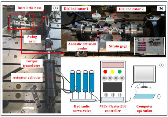 All experiments were conducted at room temperature, and the servo cylinder was controlled by the hydraulic drive system. One section of the swing arm was connected to the cylinder, and the other end was connected to the specimen adapter section. Further, one section of the specimen was fixed to the adapter section, and the torque was applied to the adapter section by the swing arm and then transferred to the specimen. The other end of the specimen was fixed by full restraint; the installation of the experimental system devices and the specimen are shown in Figure 8a,b. The entire experimental process was controlled by the computer, which was connected to an MTS Flextest200 controller (Germany), and the controller was connected to the torque sensor and the hydraulic servo valve through the cable. The servo valve controls the oil in and out of the hydraulic cylinder according to the command value given by the computer, as shown in Figure 8c.