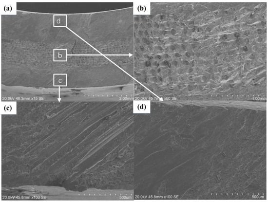 Figure 12a,b show that the fibre fracture was mainly in the titanium matrix in the 90° direction, while the SiC fibres did not fracture strictly in one plane when they were carried off by the titanium matrix. Therefore, the SiC fibre fracture surface had some undulations. Further, during the twisting process of the shaft, the titanium matrix on both sides of the fracture extruded and rubbed each other, leading to the formation of a large area of plastic deformation. More shear tough nests appeared in the titanium matrix on the shaft fracture, which is a typical ductile fracture feature. From the abovementioned observations, it can be concluded that, during torsional static loading, a large amount of plastic deformation of the titanium matrix occurs under the action of shear stress. The titanium matrix drives the SiC fibres to shear fracture, which eventually leads to overall damage to the specimen.