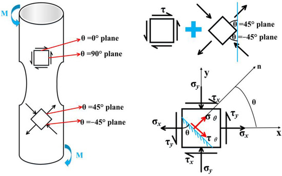 A schematic of a hollow homogeneous shaft subjected to torque is shown in Figure 13. The orientation of an element of the material, which is aligned with the axial/circumferential direction, is also shown in Figure 13, along with the shear stress [15,16] associated with this element orientation. The stress state associated with a general element orientation is included in Figure 13, along with those of the and orientations. It should be noted that defines the plane on which the stress acts, such that the planes defined by and carry purely shear stresses, while the planes defined by carry purely direct stresses. The fibres were wound onto the shaft at 45°. The 45° fibre orientation caused the fibre direction to be perpendicular to the plane, as defined in Figure 13. This is the plane of the maximum tensile stress.