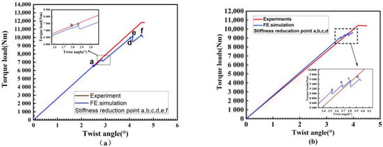 The results of the model torsional strength calculation are shown in Figure 15. In particular, the [45°]6 model exhibited different degrees of reduction in the stiffness at points a, b, c, d, e, and f as the load increased, and final fracture occurred at 10,281.7 Nm. The [45°]10 model exhibited failure primarily at the interface, matrix, and fibre between 9000 Nm and 10,000 Nm, and finally fractured at 9545 Nm.