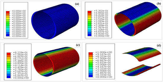 MDI of the interface element of the [45°]6 RVE model: (a) M = −2000 Nm; (b) M = −4000 Nm; (c) M = −6000 Nm; (d) M = −6552 Nm.