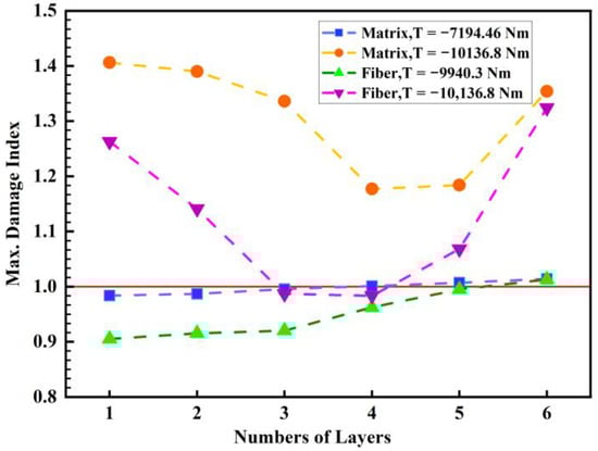 When the torque reached −9940.31 Nm, the MDI of layer 6 fibres reached 1.013, which indicates that the fibres exhibited damage first; this corresponds to the stiffness fracture at point d in Figure 15a. This outcome is consistent with the signal of interface cracking monitored by the acoustic emission shown in Figure 10a. The large amount of plastic deformation that occurred after the damage to the matrix led to the fracture of the SiC fibres. Point e in Figure 15a shows the stiffness reduction corresponding to fibre damage when the load reached −10,136.80 Nm. The trend of MDI values of each layer of the fibre and matrix under this load is shown in Figure 17; the trend of the MDI of the matrix and fibre was the same. When the 1st and 6th layers of the matrix in the reinforced section almost failed, the matrix became useless and debonding with the fibre led to the inability to equalize the load. Therefore, the fibres experienced transverse instability, resulting in the fibre MDI of the 1st and 2nd layers reaching 1, along with the 5th and 6th layers, which began to lose stability and fail. This result means that the model started to crack from the 1st and 6th layers to the intermediate layers of the reinforced section. Point f in Figure 17a shows the stiffness fracture corresponding to the fibre damage when the load reached −10,282.00 Nm, at which time all layers of the fibres in all directions fractured.