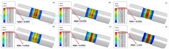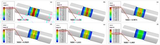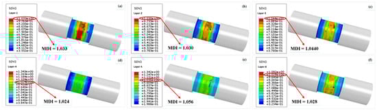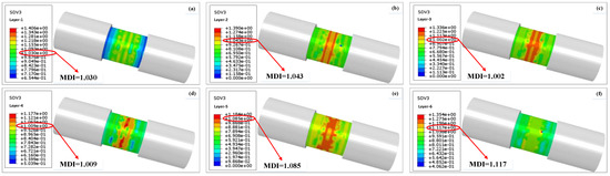 MDI of the interface element of the [45°]10 RVE model: (a) M = 1000 Nm; (b) M = 3000 Nm; (c) M = 5000 Nm; (d) M = 7000 Nm; (e) M = 9100 Nm; and (f) M = 9108 Nm.