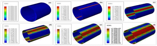 Based on the macro–micro mechanics transformation method in Section 4.1, the stress of the danger position element of the model (the danger element appeared in layer 6) was extracted by calculating the response results of the [45°]6 shaft model under torque, which were transformed into transverse and longitudinal loads, and then added realistically to the RVE model. The MDI of the interface of the RVE model was also calculated, and the corresponding value under different loads was obtained, as shown in Figure 16. The applied torque started from 0 Nm; when the torque reached −6552 Nm, the interface exhibited cracking and the MDI reached 1, as shown in Figure 16d. This torque is the interface critical cracking load, which corresponds to point a in Figure 15a, which reflects the appearance of interface cracking. Then, stiffness fracture occurred, which is consistent with the interface cracking signal monitored by acoustic emissions, as shown in Figure 10a. The MDI of the matrix and fibre had not reached 1 for all layers before the interface cracked. The damage process of the matrix and fibre can be observed using a macroscopic model with increasing load.