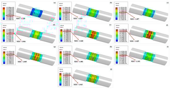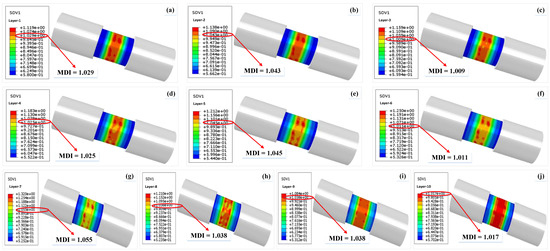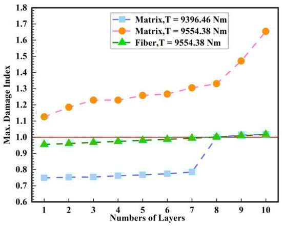 The critical load for interface failure was 9108 Nm, and after crack failure at the interface, it instantly extended transversely to the matrix, and matrix failure occurred immediately afterwards. When the load reached 9396.46 Nm, the matrix in the reinforced section of the model failed, as shown in Figure 24. The MDI of the 10th layer was 1.019, extending inward to the 8th layer, and the failure of the interface and matrix occurred almost simultaneously. Point b in Figure 15b represents the stiffness reduction corresponding to the appearance of matrix damage; this result is basically consistent with the acoustic emission experimental results. As the load increased, when the torque reached 9554.38 Nm, the matrix damage extended inward from the 10th layer to the 1st layer, as shown in Figure 24. The MDI exhibited a decreasing trend from the outer layer to the inner layer; the damaged area also gradually became larger from the 1st layer to the outer layer, and the damaged area of the 10th layer was the largest and the most severe, as shown in Figure 25. Point c in Figure 15b shows the corresponding stiffness reduction after the failure of the matrix of all layers, at which time the matrix no longer had the ability to carry and transfer force. Thereby, more load was transferred to the destabilized fibres, which were then carried by these fibres.