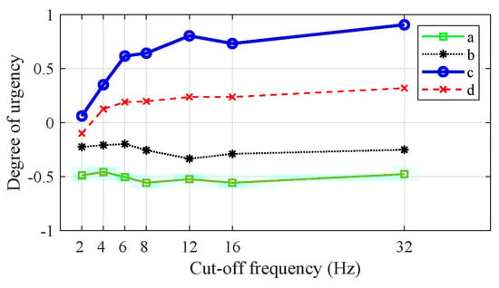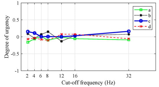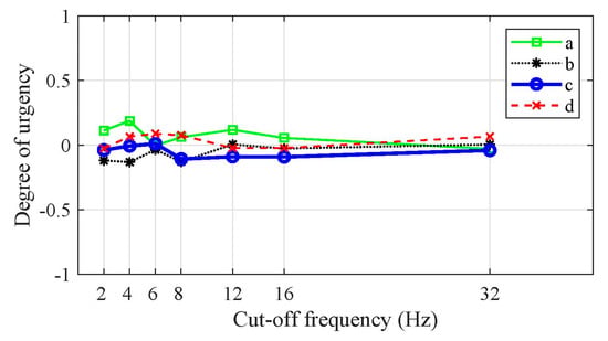 The results under the LPF condition are shown in Figure 5, where the horizontal axis indicates the cut-off frequency of the LPF, and the vertical axis shows the urgency scale (positive values indicate a higher degree of urgency). As we can see, the degrees of urgency from lowest to highest are ordered as the same as the results of experiments I and II. The degrees of urgency for stimuli c and d decreased as the cut-off frequency decreased. ANOVA analysis indicated a significant main effect of urgency perception () and significant differences among all stimuli in c and d, where the cut-off frequencies ranged from to Hz (). With the cut-off frequency of 2 Hz, significant differences were observed among all stimulus pairs except b & d and d & c ().