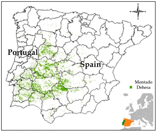 Montado is characterized by an arboreal stratum formed by trees with open canopies, dominated by holm oaks, cork oaks or other quercines (Quercus genus), and by herbaceous annual species and shrubs [9]. So, it is an agro-silvo-pastoral ecosystem, multifunctional, and characteristic of the Alentejo region in Portugal, where agricultural, livestock and forestry, beekeeping, forestry, hunting, and tourism activities are combined [1,9,10,11]. This agro-silvo-pastoral system, typical of semi-arid Mediterranean conditions, is called “Dehesa” in Spain. In the Iberian Peninsula, Montado occupies 73,000 Km2 (7,300,000 ha), where cork oaks (Quercus suber L.), holm oaks (Quercus rotundifolia Lam.), and black oaks (Quercus pyrenaica Willd.) are found [12,13]. In Portugal, the Montado represents 33% of the forest area [14,15]. A recent work mentions that the Portuguese territory is occupied by 1 million hectares of Montado [16]. Figure 1 shows the distribution of Montado/Dehesa in the Iberian Peninsula.