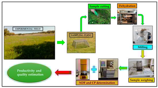 Regarding the methods for assessing pasture biomass, they are grouped into direct and indirect [81]. Direct methods require cutting and laboratory determinations (Figure 4), while indirect methods use sensors to assess the pasture. Laboratory methods for quantifying pasture nutritive value are expensive and time-consuming, and due to the high cost of determinations, sampling is limited to specific locations, which limits the possibility of managing or exploring variability within and between pastures [7].