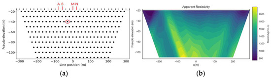 (a) Pseudosection’s setting and observation points in pseudo-elevation for dipole–dipole array, and (b) corresponding pseudosection of apparent resistivity data.