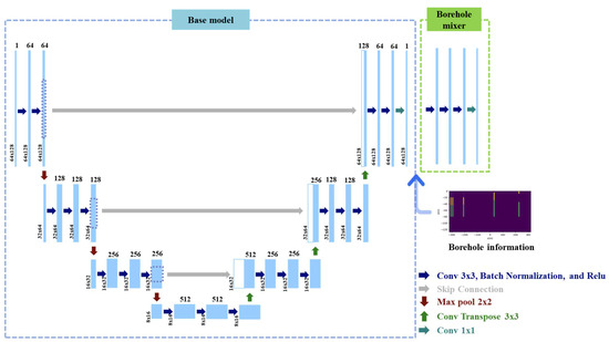 where denotes the model parameters of the base network, Base(), and is the predicted resistivity model of the base network. Note that the base model does not require borehole information. As illustrated in Figure 6, the base model employs a modified U-Net structure, which is a simplified version of the existing U-Net [32]. The inputs and labels m of this network are pseudosections of apparent resistivity and the corresponding 2D resistivity models, respectively, each having a size of 64 × 128. In the encoding path of the base model, the first convolution block is composed of two 3 × 3 convolutional layers and one 2 × 2 max-pooling layer. Other convolution blocks comprise three 3 × 3 kernel-size convolutional layers and one 2 × 2 kernel-size max-pooling layer. Batch normalization is applied after each convolutional layer to increase the learning speed and stabilize the learning process [33]. The rectified linear unit (ReLU) activation functions [34] are added for the convolutional layers. The decoder is symmetrical to the encoder, and the transposed convolutional layers are used to perform up-sampling in the decoding path [35]. Skip connections are used to prevent the loss of data information by directly connecting the encoder layer to the decoder layer. The detailed structure of the base model is presented in Table 1.