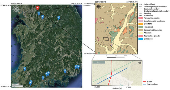 Faults are typically characterized by soft ground as rocks become fractured and clays and groundwater are introduced due to repeated movements over time. Therefore, faults are considered a crucial aspect in investigations of site characteristics for large-scale construction, such as geological surveys, tunnels, and bridges, as well as in ground stability assessment, including ground subsidence, tunnel collapse, and slope stability investigations [1,2,3]. Geophysical exploration techniques, including seismic, electrical, and electromagnetic methods, are actively being used in various fields to detect faults [4,5,6,7,8,9]. In particular, fault zones, weathered zones, and aquifers containing clay minerals exhibit low electrical resistivity, making electrical resistivity tomography (ERT) surveys an effective tool in fault zone investigations [10].
