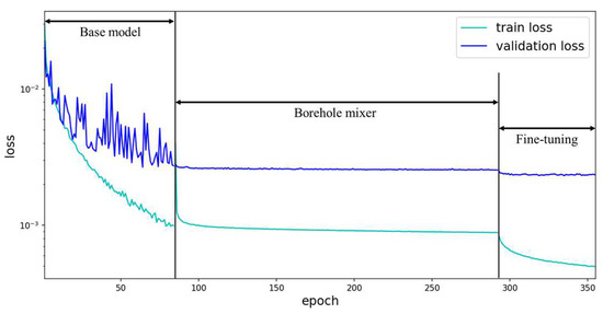 The training of the model was divided into three stages: base model training, borehole mixer training, and fine tuning. We used the Adam optimizer with a batch size of 256 and a maximum of 300 epochs. The learning rates were set to be different in each stage, decreasing by a factor of 10 each time, from 10−3 to 10-−5 in the three stages. Figure 10 shows the loss curve for base model training, borehole mixer training, and fine tuning. All experiments were carried out on TensorFlow 2, and two GPUs (NVIDIA GeForce RTX 2090 Ti) were used to accelerate computation.