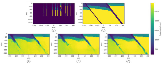 Prediction results of DL-ERT inversion for the one-fault structure: (a) boreholes injected during training, (b) ground truth, (c) base model result: NRMSE = 0.0343, (d) borehole mixer training result: NRMSE = 0.0272, and (e) fine-tuning result: NRMSE = 0.0217.