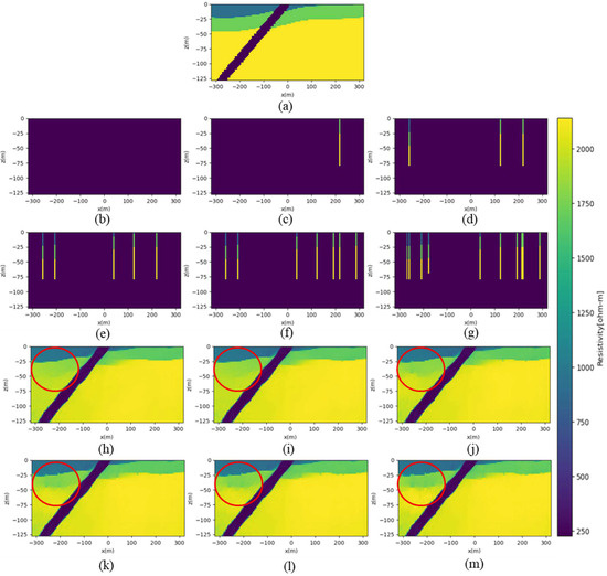 Prediction results of DL-ERT inversion according to the number of boreholes. The NRMSE values obtained with an increase in the number of boreholes are 0.0707, 0.0706, 0.0689, 0.0680, 0.0679, and 0.0669. (a) Ground truth. Number of boreholes = (b,h) 0; (c,i) 1; (d,j) 3; (e,k) 5; (f,l) 7; and (g,m) 10.