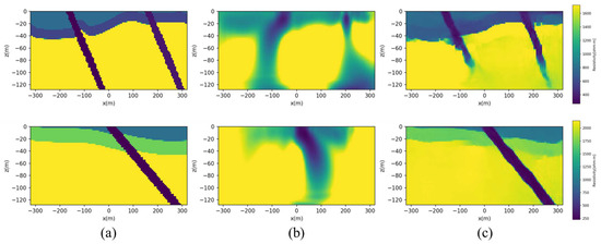 Finally, we compared our results with those from conventional deterministic inversion methods. In this work, we used the conventional smoothing least-squares inversion method with SimPEG. As shown in Figure 15, the deep learning-based model shows superior prediction accuracy compared with the conventional inversion method, as it more accurately predicts the layers and the direction and position of the fault zone.