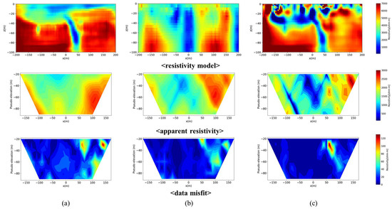 For the forward modeling using SimPEG, we set the survey as a dipole–dipole array with a range of −320–320 m. The spacing between the electrodes was set to 20 m, and the maximum number of repetitions of the receiver for each transmitter was limited to 10.