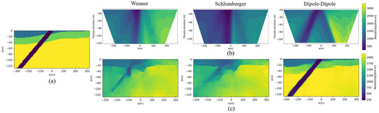 Lastly, our current DL-ERT inversion model has been specifically trained for the dipole–dipole array configuration. Consequently, applying the model to other electrode configurations may yield suboptimal results due to inherent differences in data characteristics. We conducted an experiment comparing the performance of our model with Wenner, Schlumberger, and dipole–dipole arrays (Figure 18), confirming that our current DL-ERT model is not well-suited for non-dipole–dipole arrays. Addressing this limitation and developing a more versatile model capable of accommodating different electrode configurations will be the focal point of our future research.