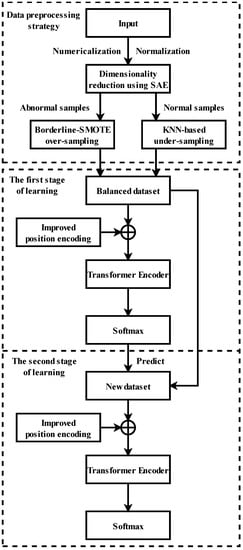 This paper proposes an improved Transformer-based intrusion detection model. Specifically, this paper first proposes a data processing strategy that uses SAE to reduce the dimensionality of the dataset while ensuring the same amount of information, speeding up model training. Additionally, a KNN-based under-sampling method is proposed, combined with the Borderline-SMOTE over-sampling method to perform mixed sampling on the dataset, balancing the dataset and greatly alleviating the class overlap problem. Then, an improved position encoding method for Transformer is proposed, learning the position dependencies between features by embedding the positional relationships of features, thereby improving the model’s detection ability. Finally, a two-stage learning strategy is proposed to enhance the model’s multi-classification ability.