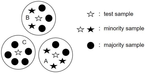 | Procedure: (1) All minority samples are labeled as samples to be tested. (2) Calculate the distance between each sample to be tested and all other samples. (3) Rank the distances and select the five nearest samples. (4) Samples for which more than half of their K-nearest neighbors are also minority samples are labeled as Safe, as shown as A. (5) Samples for which more than half of their K-nearest neighbors are from the majority class are labeled as Danger, as shown as B. (6) Samples for which all their K-nearest neighbors are majority samples are labeled as Noise, as shown as C. |