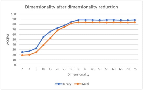 After numerical and standardization preprocessing, the dimension of the NSL-KDD dataset was reduced to 122. To prepare the NSL-KDD dataset for training the Transformer encoder classifier, a stacked auto-encoder was employed to further reduce the dataset’s dimension after numerical and standardization preprocessing. The encoding layers of the SAE were used for dimensionality reduction, and various feature subsets consisting of different numbers of features were input into the overall model for binary and multi-class classification. The impact of varying degrees of dimensionality reduction on model accuracy was evaluated, and the results are shown in Figure 8.