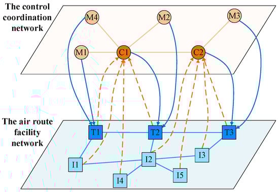 With the continuous development of China’s aviation industry, the aviation network has become an indispensable infrastructure network in human society. At the same time, the air traffic control network has also become more complex and has been continuously improved. From 2019 to 2021, there were a total of 49 general aviation accidents and 1569 transport aviation incidents in China’s civil aviation sector [1]. In recent years, traffic accidents that cause flight delays or cancellations due to weather, malicious attacks, equipment failures, and other reasons have occurred frequently, which has raised social concerns about the security of the ATC network [2]. The ATC network is a network that provides air traffic management services by multiple control units through remote networks and related physical service facilities. These control units interact with physical service facilities remotely, such as aircraft, reporting points, ground-to-air communication facilities, ATC monitoring facilities, radar facilities, telemetry facilities, meteorological service facilities, etc. On the one hand, the control units control the operation of physical service facilities, and on the other hand, these physical service facilities provide relevant security services for the control units of the ATC network. A self-organized interdependent network has formed within the ATC network.