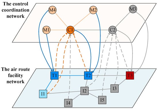 To further illustrate the control dependency relationships, service dependency relationships, and failure rules in the cascading failure model of the air traffic control network, an example is presented in this section to analyze the evolution of cascading failures in the network. In this example, as shown in Figure 5, there are two layers of networks, the control coordination network and the air route facility network . The control coordination network at the top contains two control nodes, and , and four coordination nodes, , , , and . The air route facility network at the bottom contains three route nodes , , and , and five facility nodes , , , , and . The control dependency relationship between the control nodes and the nodes in the air route facility network is as follows: