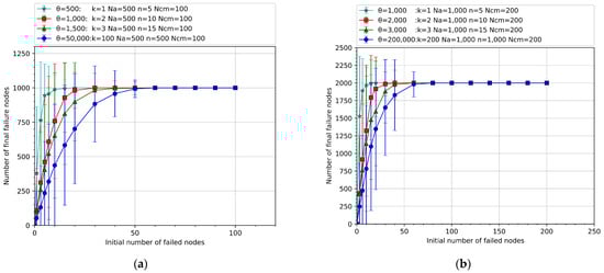 Here, represents the initial number of failed nodes, represents the final number of failed nodes, and represents the number of nodes in the air traffic control network. The stronger the anti-destructive ability of the network, the smaller the final number of failed nodes at the steady-state of cascading failure will be, under the same initial number of failed nodes , and the larger the load failure threshold value of the system will be.