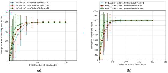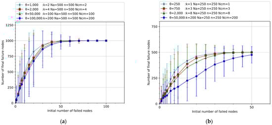 In this set of experiments, when the number of nodes in the network topology of the cascading failure model in the air traffic control network is determined (i.e., and are determined), with the increase of the initial number of failed nodes , the final number of failed nodes and the load failure threshold value of the system were compared under different control capacities when the cascading failure ended and the network reached the final steady state.