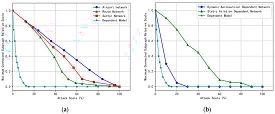 As shown in Figure 11a, literature [31,32] modeled the airport network and found that the largest connected subgraph of the airport network is approximately inversely proportional to the attack ratio when subjected to random attacks. Literature [32] modeled the airport network, route network, and sector network, based on domestic flight data in China. Under random attacks, the robustness of the network, from weak to strong, is: route network, sector network, and airport network. However, in the actual operation of the air traffic control network, the elements of each node, such as route points, sector nodes, and airport nodes in the route network, sector network, and airport network, are not operated independently. There are certain internal connections between them. The models in literature [31,32,33] did not consider the dependency between the various node elements in the network, greatly underestimating the size of the cascading failure of the air traffic control network.