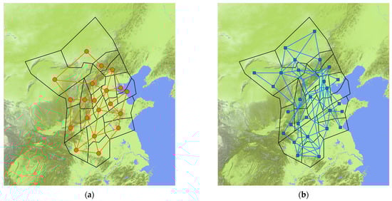 As shown in Figure 11b, literature [34] modeled the air traffic control network in North China, based on data from the region, and constructed a three-layer interdependent network consisting of airport network, route network, and control network, adding bidirectional and unweighted connections outside to simulate the dependency between networks. Due to its simple failure rules that do not fully describe the actual dependency relationships, the North China air interdependent network model largely underestimates the size of the cascading failure of the air traffic control network. The schematic diagram of the air traffic control network in North China is shown in Figure 12. The interdependent air traffic control network model was used to model the North China air traffic control network. Compared with the North China air interdependent network model in literature [34], the interdependent air traffic control network model takes into account the heterogeneity of the network and defines the complex interaction relationship between the control coordination network and the air route facility network. The model defines control dependency and service dependency, clearly reflecting the propagation rules of cascading failures in the network. Compared with the models in literature [31,32,33,34], the interdependent air traffic control network model performs better and can predict more node failures and better predict changes in cascading failures in the network.